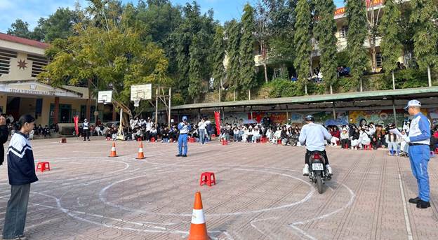 Thay vì chỉ nghe giảng, 50 học sinh đại diện đã trực tiếp tham gia phần kiểm tra lý thuyết và thực hành trên sa hình. Dưới sự giám sát chặt chẽ của cán bộ Trạm CSGT Tuần Giáo và các huấn luyện viên, các em được hướng dẫn chi tiết từ những thao tác cơ bản nhất: cách lựa chọn và đội mũ bảo hiểm đạt chuẩn; tư thế ngồi đúng khi điều khiển xe đạp điện, xe máy điện; kỹ năng phanh khẩn cấp, giữ thăng bằng và cua vòng an toàn,… Khu vực sân tập thực hành được bố trí khoa học với biển báo mô phỏng, cọc tiêu và vạch kẻ đường, tạo môi trường giả định sát thực tế nhất để các em rèn luyện.